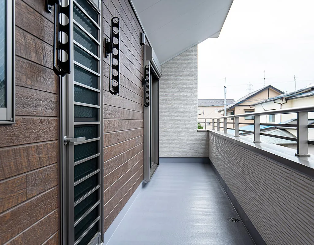 スタイリッシュな外観に玄関の格子、ベランダの勾配天井で