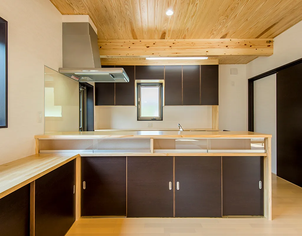 LDKの天井は、化粧梁に無節の杉板を採用しました。